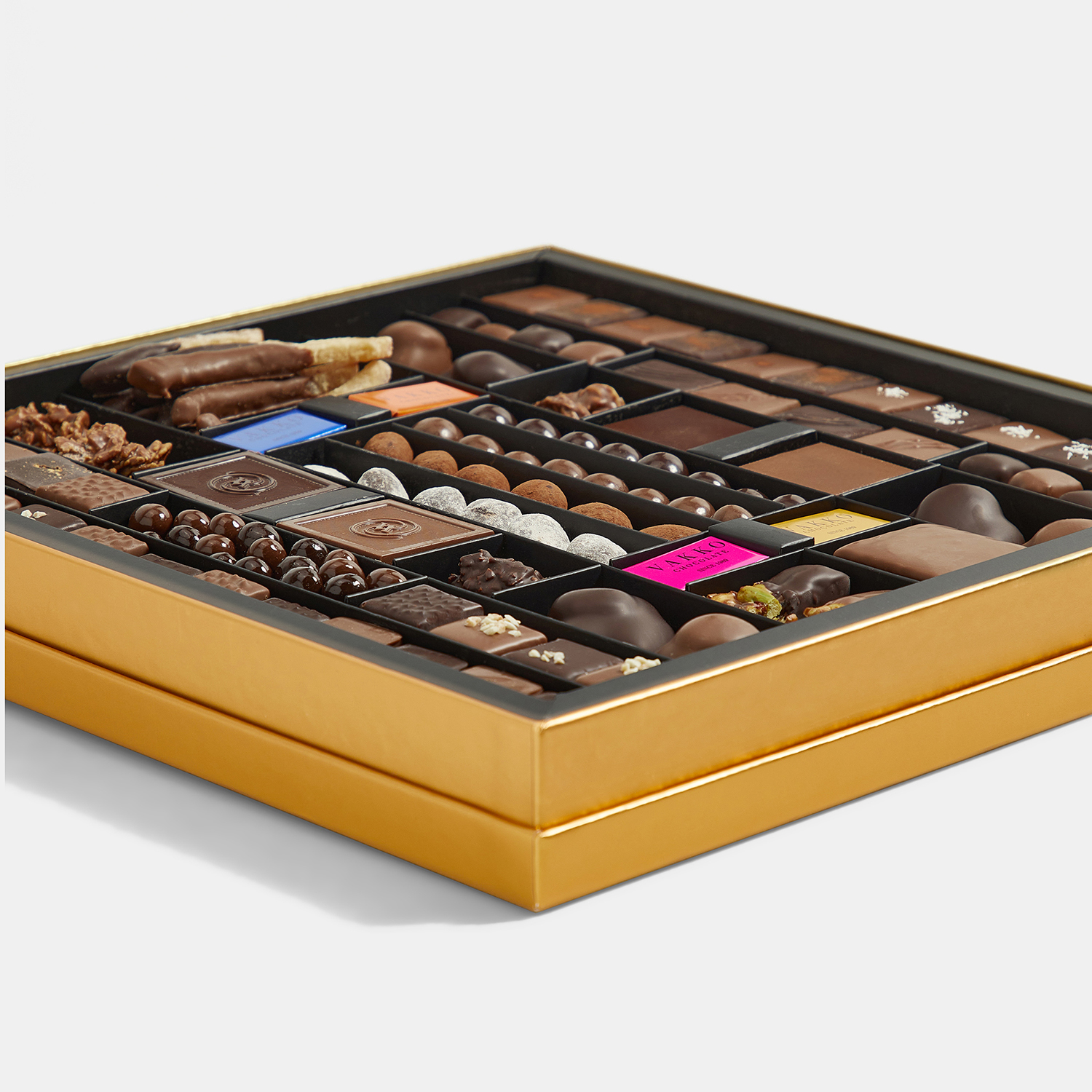 Vakko Chocolate dünyasının en özel lezzetlerini bir araya getiren muhteşem bir hediye kutusu. Vakko Konsept Çikolata; Superfine, Praline, Tuzlu Karamelli Bademli Çikolata, Pudra Şekerli Bademli Draje ve Kakao Tozlu Bademli Draje çeşitleri ile sizi benzersiz bir lezzet yolculuğuna çıkarıyor.