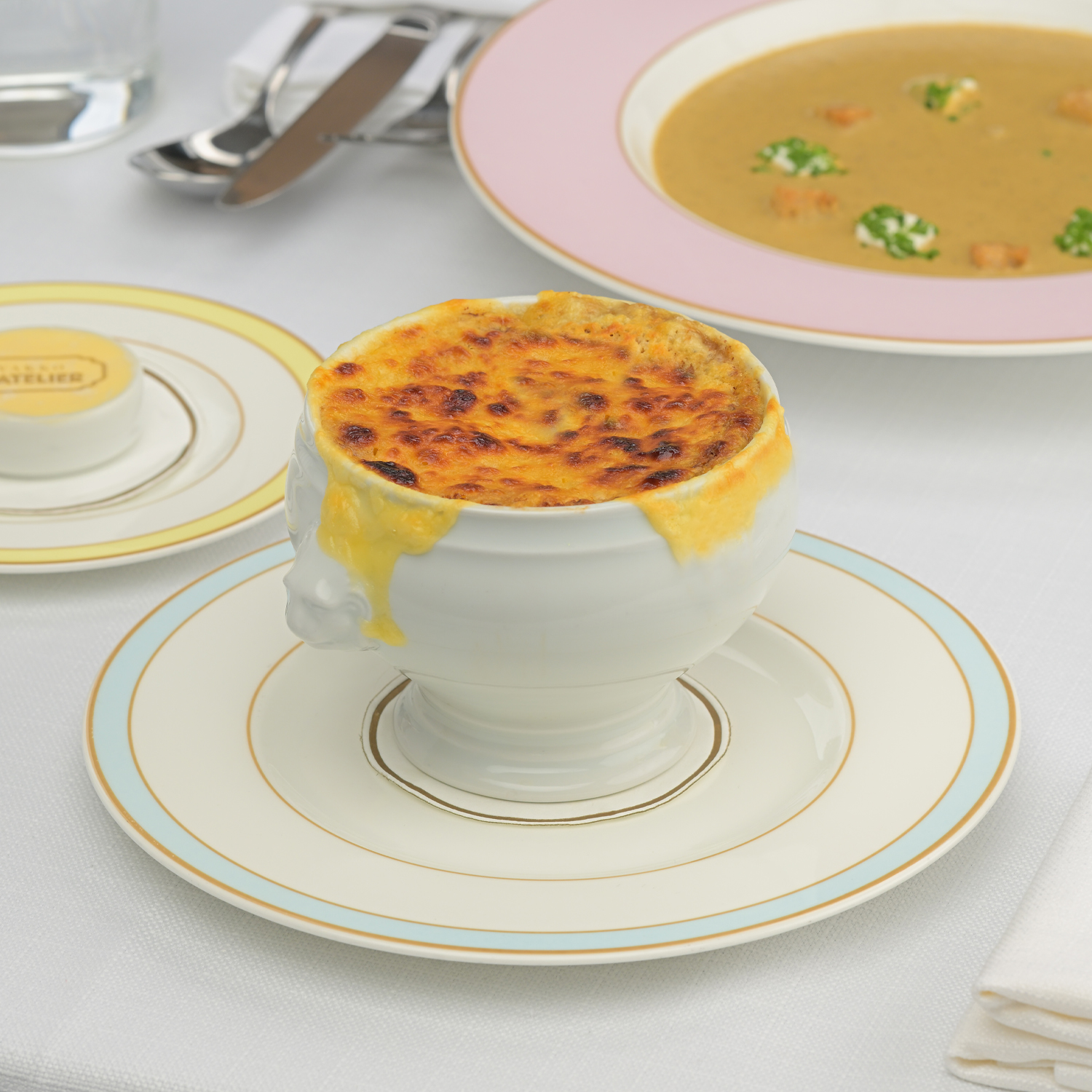 İlikli kemik suyu, soğan, beyaz şarap, worcestershire sos, emmental peyniri, shokupan ekmeği, demi-glace sos